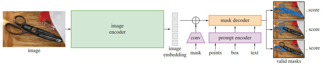 SAM은 이미지 인코더, 프롬프트 인코더, 마스크 디코더로 구성되어 있음.