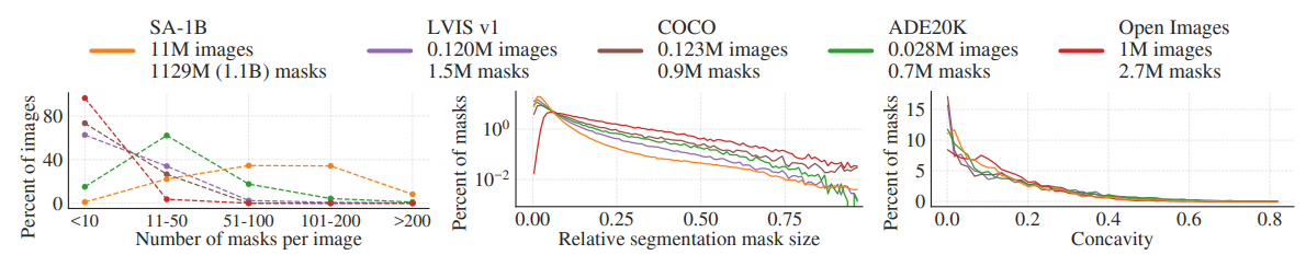 충분한 마스크 수집과 모호성 개선, 임계값을 넘는 안정적인 마스크만 선택하고 중복을 제거하는 등의 필터링으로 완전 자동으로 마스크 수집하여 11억 개의 고품질 마스크가 있는 SA-1B 데이터셋 완성.