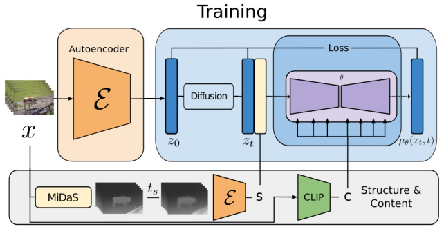 Structure를 조건화하기 위해 MiDaS DPT-Large 모델로 깊이 맵을 추정하고 블러링, 다운샘플링, 인코딩을 거쳐 zt와 연결.