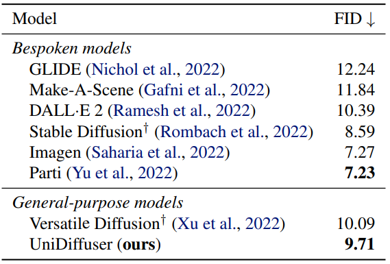하나의 모델에서 multi-modal 데이터셋과 관련된 모든 분포를 맞추는 통합 확산 프레임워크 UniDiffuser 제안.