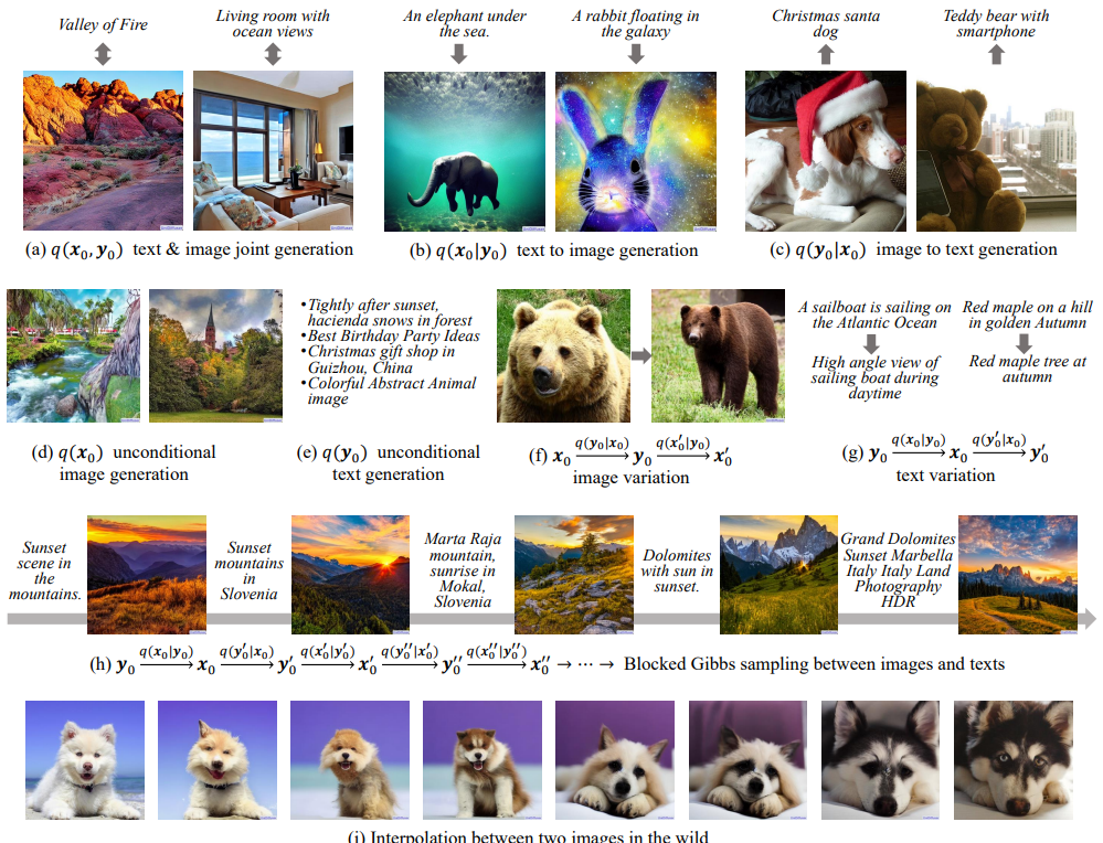 UniDiffuser는 추가 오버헤드 없이 적절한 시간 단계를 설정하여 image, text, T2I, I2T, image와 text 쌍 생성 등을 수행할 수 있다.