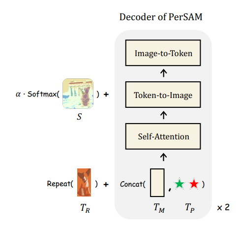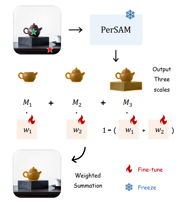또한 PerSAM은 자동화가 목적이기 때문에, 2개의 추가 피라미터를 도입하여 해결한다.
