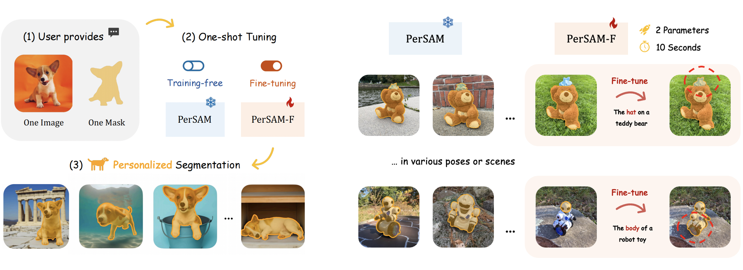 SAM(Segment Anything Model)을 위한 개인화 접근 방식인 PerSAM 제안.
