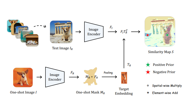 먼저 SAM을 통해 참조 이미지의 대상 개체의 임베딩을 인코딩한 뒤 테스트 이미지에서 개체와 모든 픽셀 간의 feature 유사성을 계산하여 SAM의 긍정-부정 point를 선택한다.