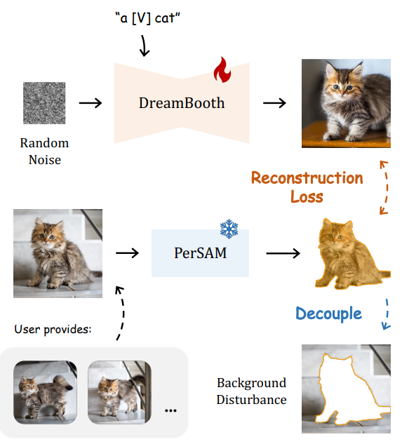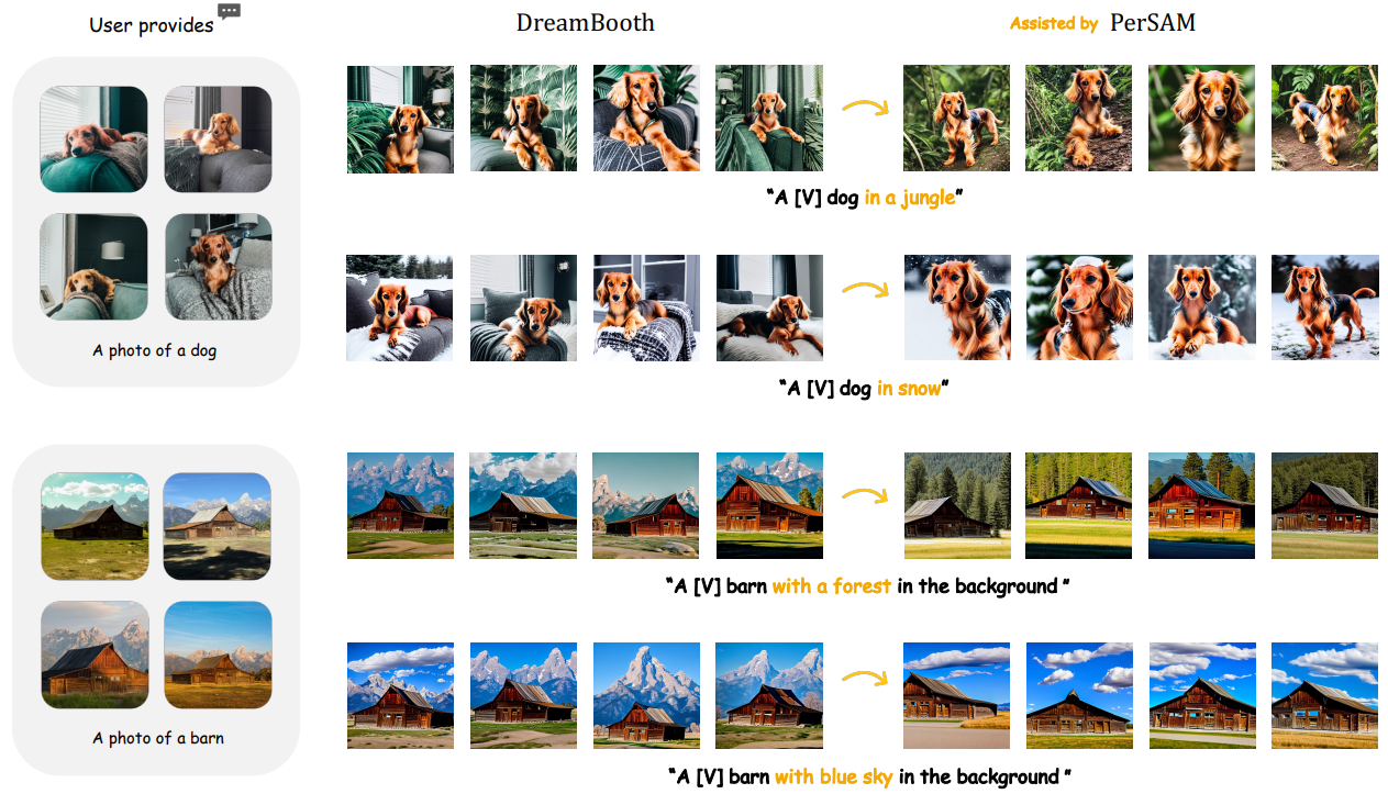 DreamBooth 및 Textual Inversion과 같은 모델 개인화 작업에서 PerSAM을 통해 background 정보를 버리고 foreground 정보만을 역전파 함으로써 더 나은 시각적 합성을 할 수 있음.