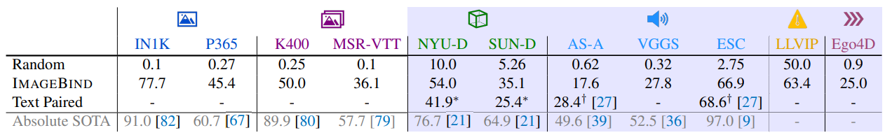 이미지의 이 binding 속성은 이미지와 관련된 모든 감각 경험과 정렬하여 시각적 기능을 학습할 수 있는 많은 소스를 제공한다.