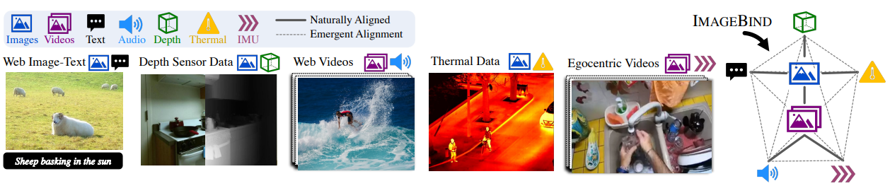 본 논문에서는 여러 유형의 image-paired 데이터를 활용하여 단일 공유 표현 공간을 학습하는 ImageBind를 제시한다.