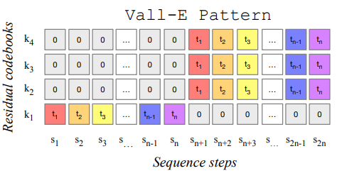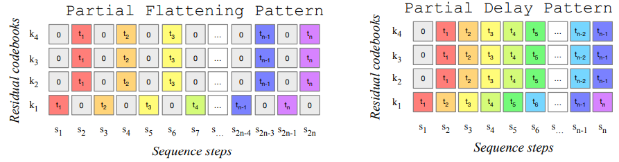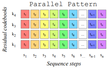 위의 방법은 한 단계에서 한 개의 코드북을 예측했다면, 또 다른 방법은 한 단계에서 다음 timestep의 모든 코드북을 병렬로 예측하는 것이다.