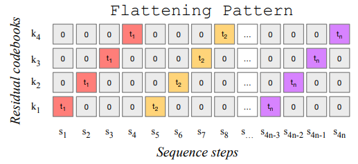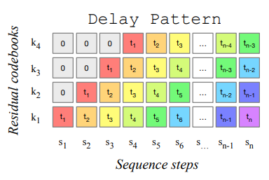 MusicGen에서는 delay pattern 사용함.