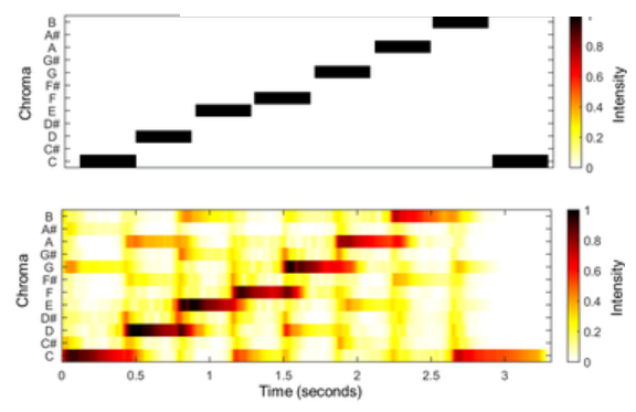 i.e.) 크로마그램이 주로 드럼, 베이스와 같은 저주파 악기에 지배되는 경향을 발견하고 음악을 드럼, 베이스, 보컬, 기타로 분해한 뒤 드럼과 베이스(멜로디에 직접적으로 관여하지 않는)를 생략하여 멜로디 구조 복구, 크로마그램 생성.