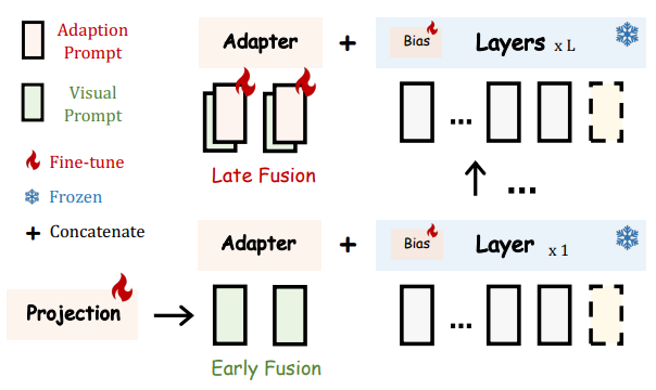 Visual prompt의 경우 zero-initialized attention과 함께 첫 번째 transformer layer의 단어 토큰에 직접 추가되고 후기 L 레이어에서 적응 프롬프트와 합쳐짐.