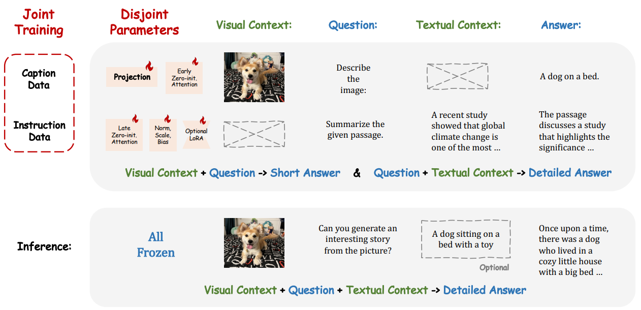 이 방법을 사용하면 multi-modal instruction data가 없어도 joint training with disjoint parameters가 가능하다고 함.