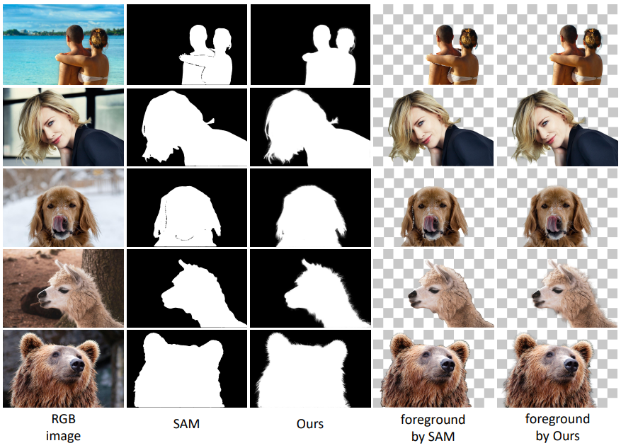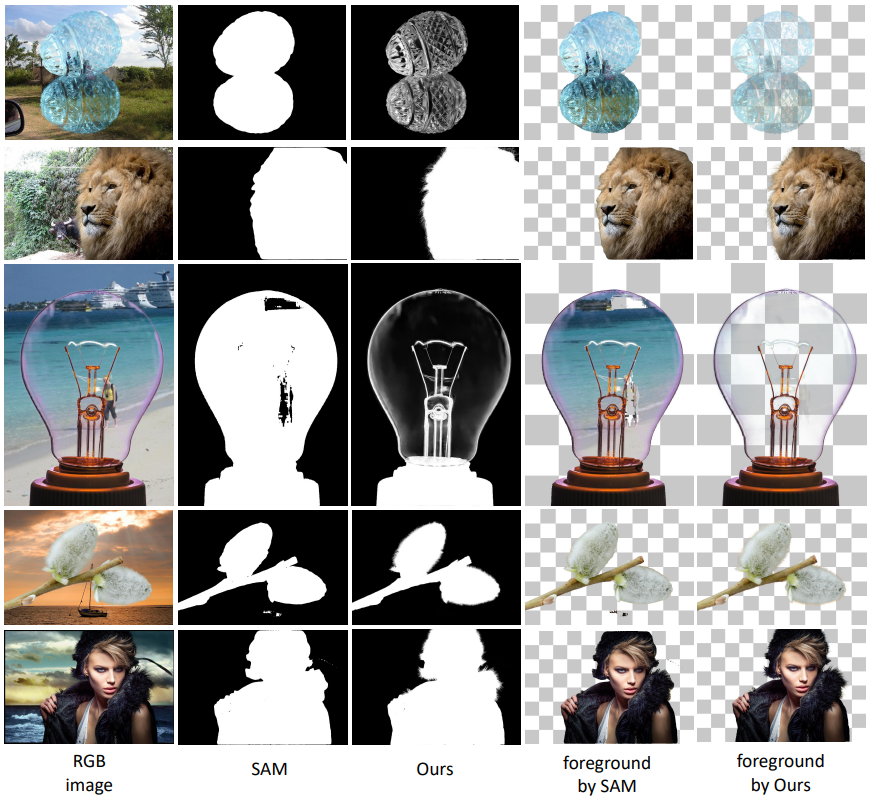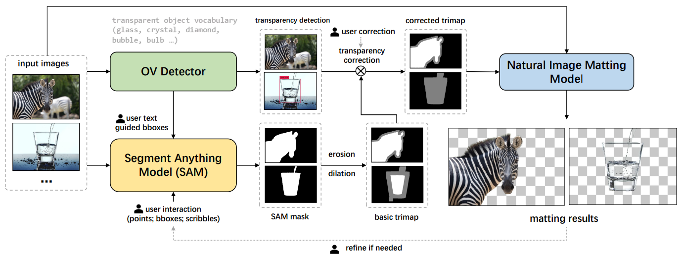 추가 교육 없이 SAM(Segment Anything Model)으로 윤곽선을 예측하고 OV(openvocabulary) detector로 투명도를 예측한 뒤 alpha matte를 생성하는 interactive matting algorithm인 MatAny 제안