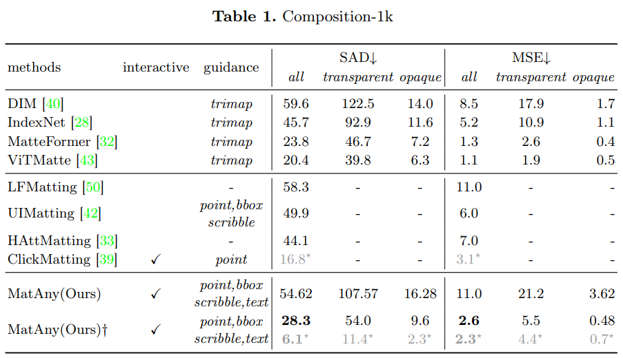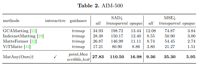 추가 교육 없이 SAM(Segment Anything Model)으로 윤곽선을 예측하고 OV(openvocabulary) detector로 투명도를 예측한 뒤 alpha matte를 생성하는 interactive matting algorithm인 MatAny 제안