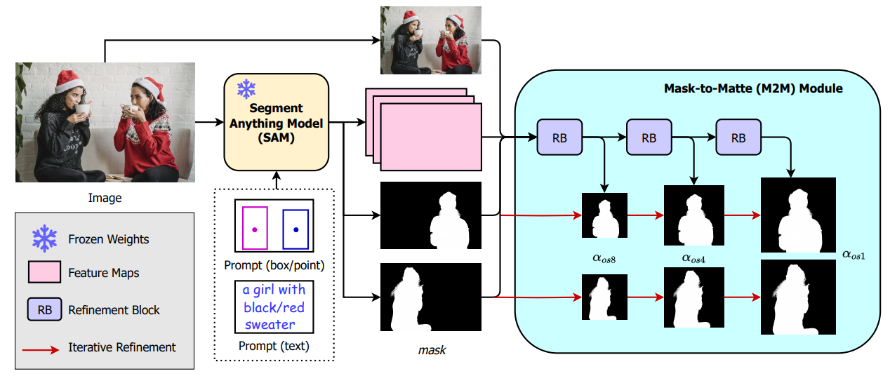 - SAM(Segment Anything Model)의 feature map에 경량 M2M(Mask-to-Matte) 모듈을 채택하여 alpha matte 예측