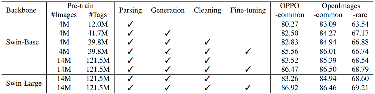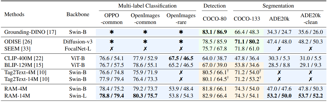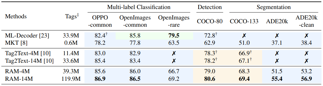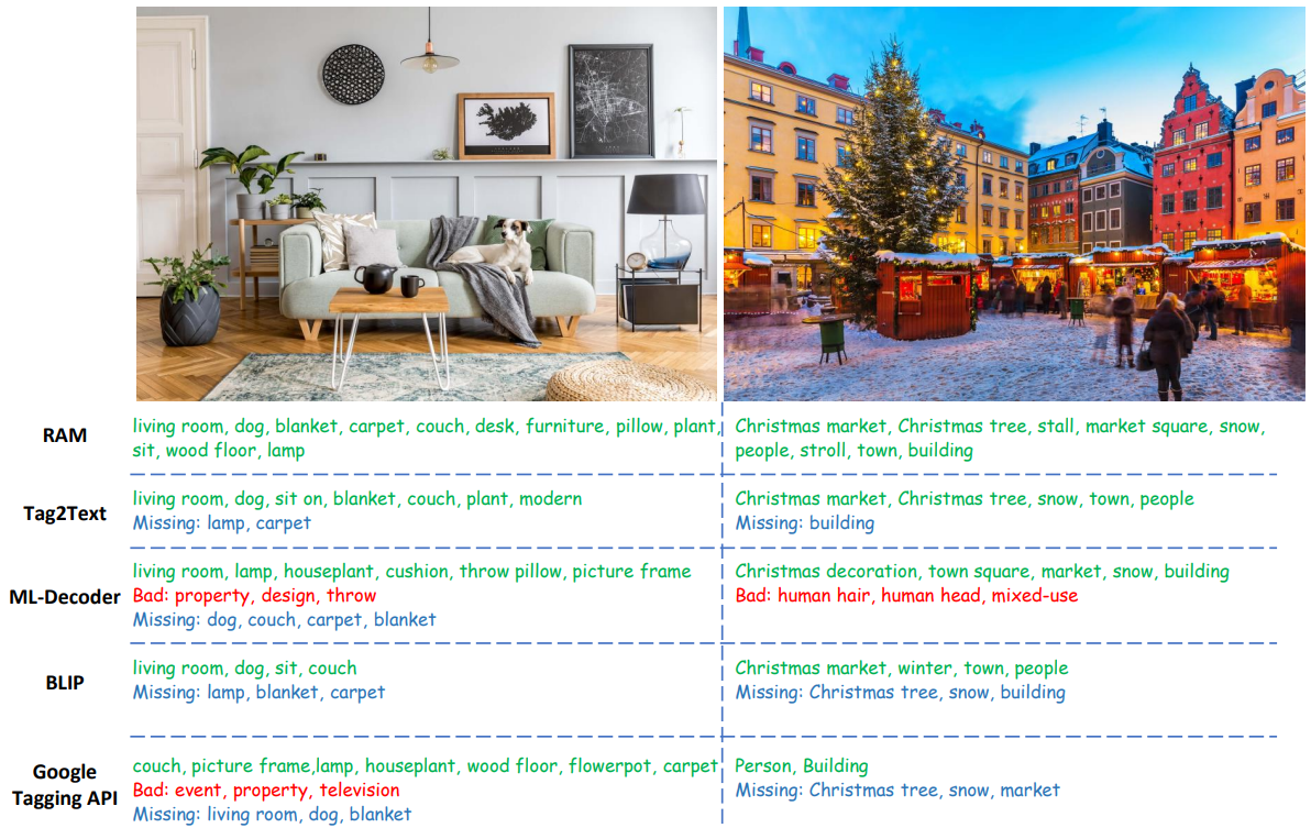 Tag2Text와의 주요 차이점은 훈련 중에 보지 못한 카테고리를 인식할 수 있다는 것.