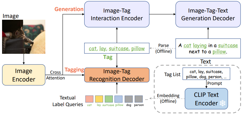 - Model : Tag2Text와 달리 zero-shot 일반화 가능