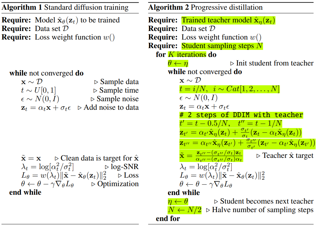 사전 훈련된 확산 모델에 대한 N-step DDIM sampler의 동작을 샘플 품질의 저하가 거의 없는 N/2 단계의 새 모델로 증류하는 절차를 제시.