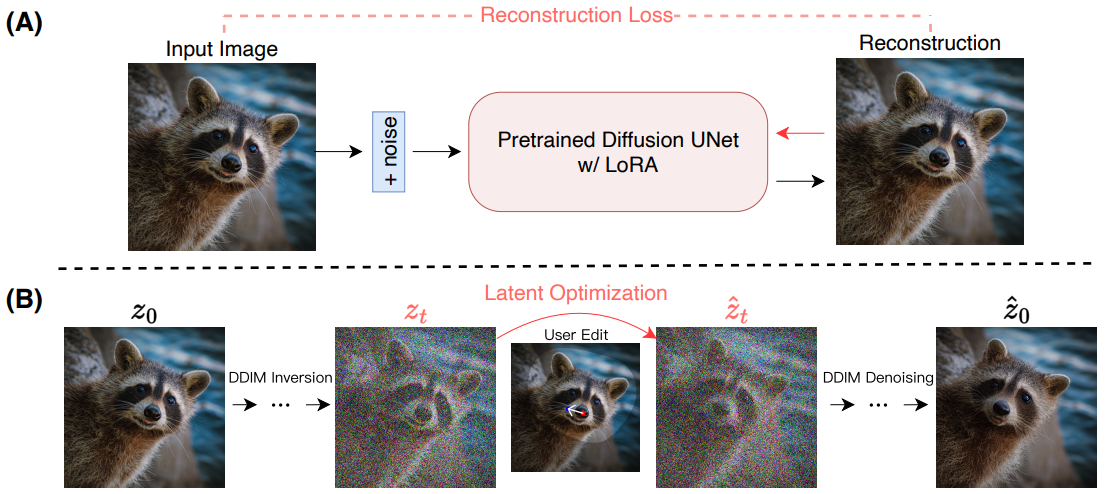편집 전 입력 이미지를 재구성하기 위해 UNet에서 LoRA를 fine tuning하여 문제 완화.