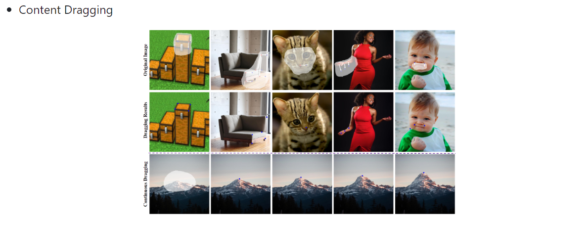 비슷한 작업으로 DragGAN이 있지만 GAN보다 확산 모델이 일반화 능력, 안정성과 생성 품질이 더 우수함.