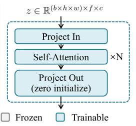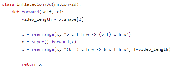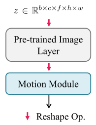 프레임 시간축이 추가된 5D(b*c*f*h*w) 텐서를 처리하기 위해 video diffusion model과 같이 원본 U-Net의 2D convolution과 attention layer를 Pseudo-3D layer로 교체하고 공간축을 따라 작동하도록 한다.