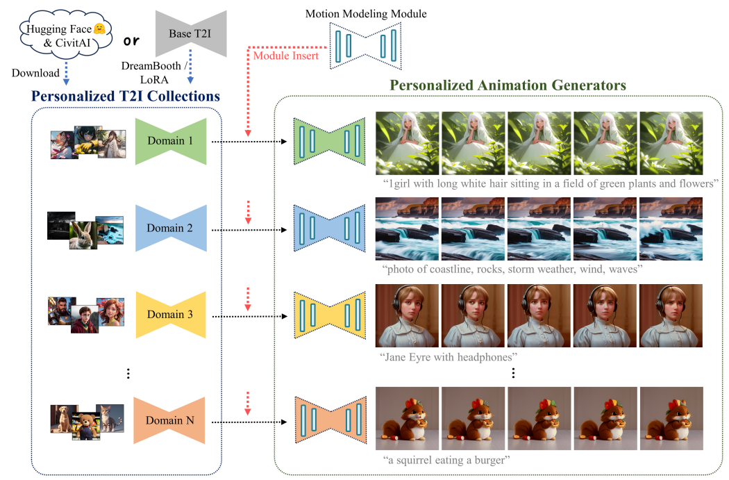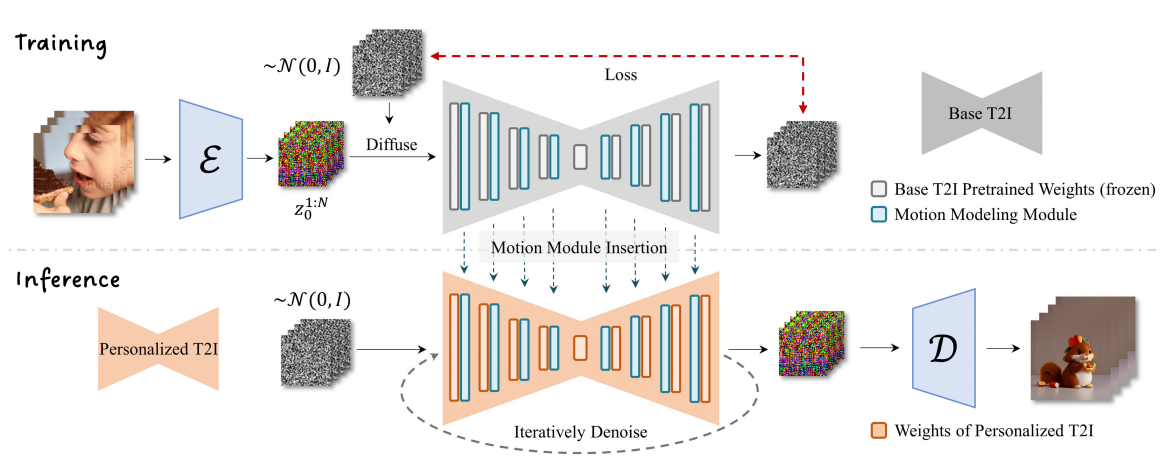Motion modeling module을 통해 T2I 모델에서 애니메이션을 생성하는 AnimateDiff 제안