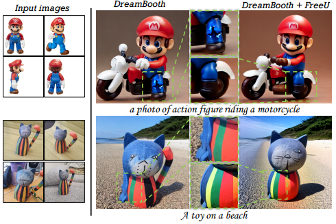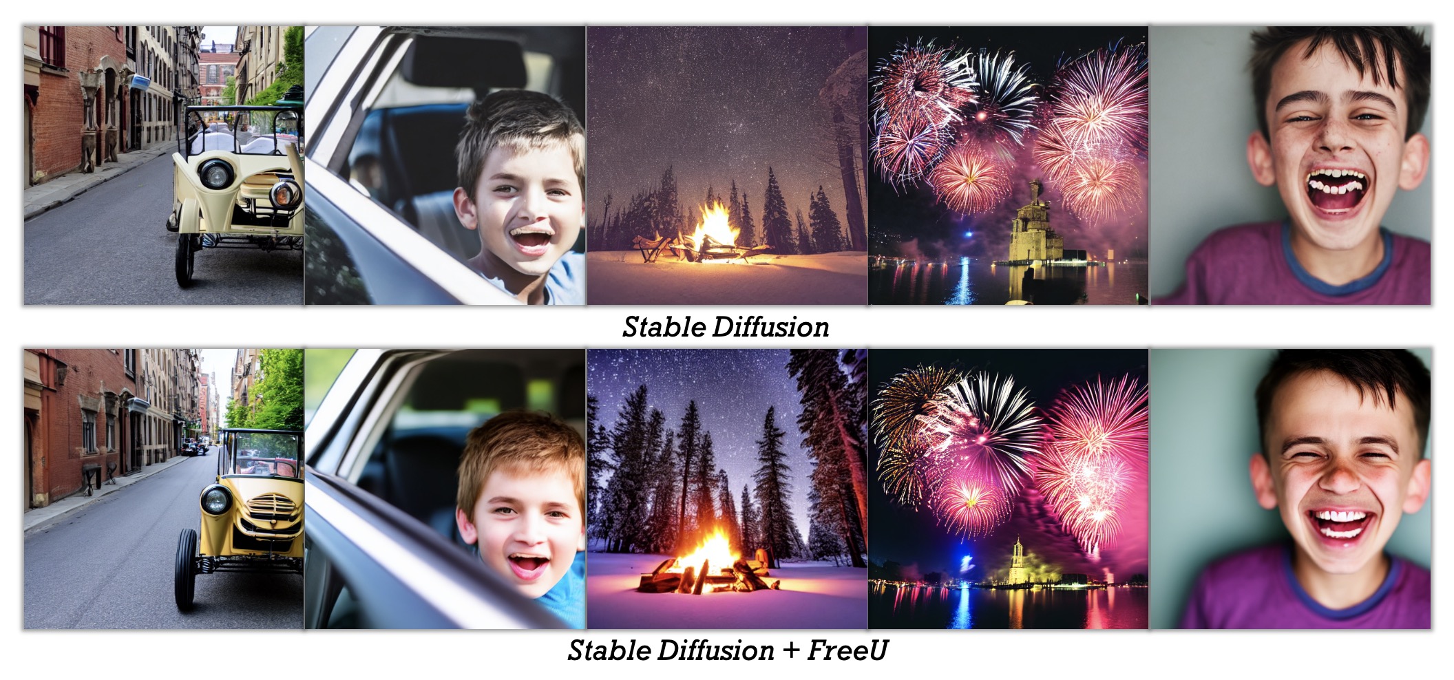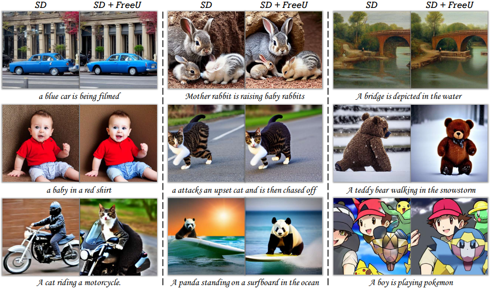 U-Net에 대한 분석을 통해 추가 교육이나 fine-tuning 없이 품질을 향상하는 방법인 FreeU 제안