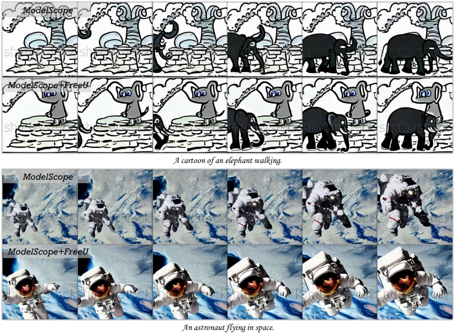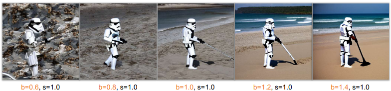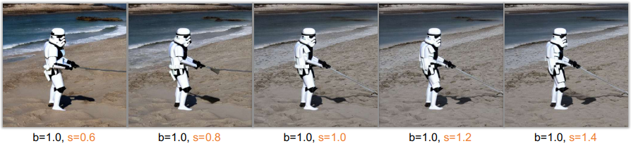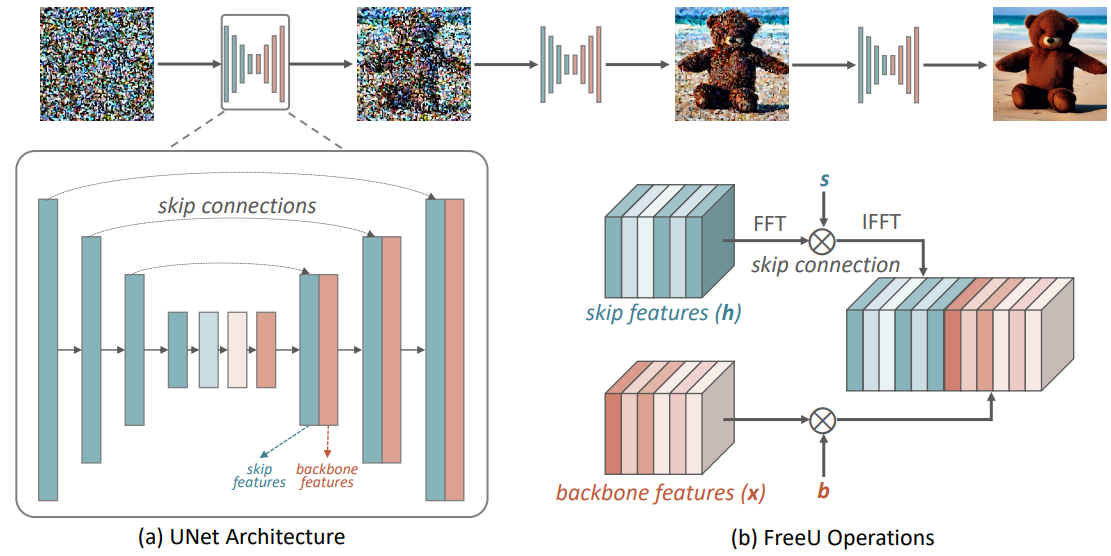 추론 단계에서 backbone feature factor와 skip feature scaling factor를 도입하여 추가 학습 없이 둘 사이의 균형을 맞춰 품질을 향상할 수 있는 freeU를 제안한다.