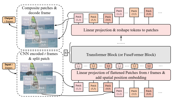 먼저 CNN으로 해상도를 줄인 후 모든 프레임의 모든 패치를 인코딩, transformer blocks를 지나고 다시 CNN을 통과하여 출력.