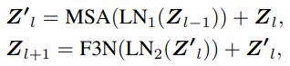 레이어 정규화(LN) 후 self-attention, 또 LN 후 F3N.