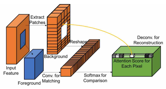 먼저 배경(background)에서 패치(3x3)를 추출하고 누락된 패치(foreground)와의 코사인 유사도, softmax를 이용하여 각 픽셀에 대한 attention score 얻음.