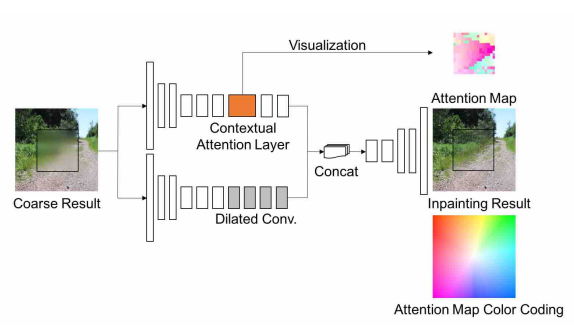 Contextual attention layer는 누락된 패치를 생성하기 위해 알려진 background patch에서 feature를 빌리거나 복사할 위치를 학습.