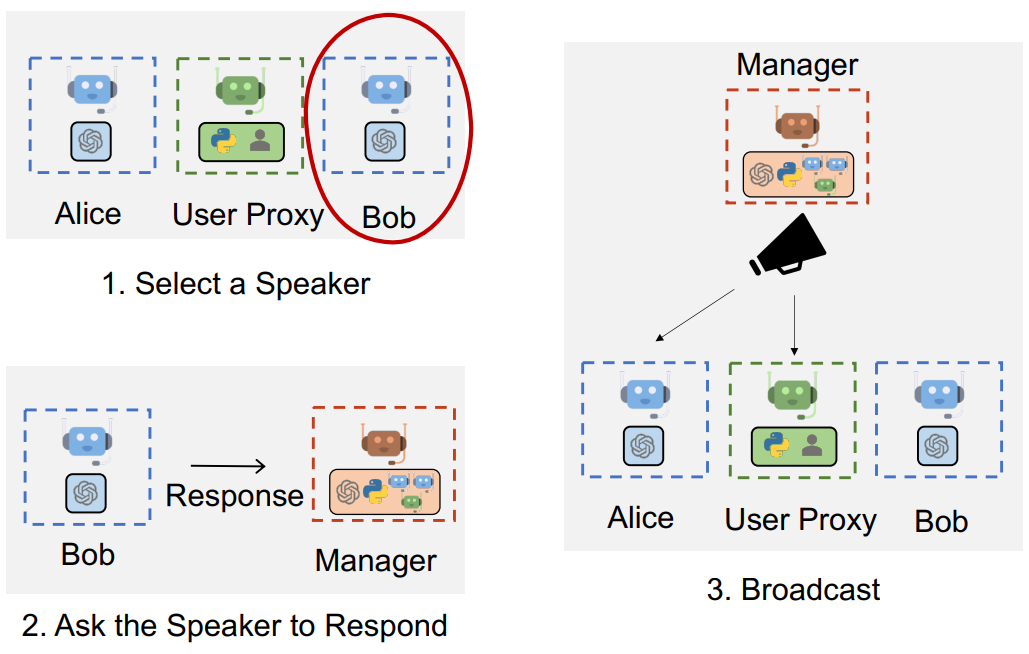 또한 다음 화자를 동적으로 선택한 다음 해당 응답을 다른 에이전트에게 broadcast 할 수 있는 GroupChatManager를 통해 더 복잡한 그룹 채팅 지원.