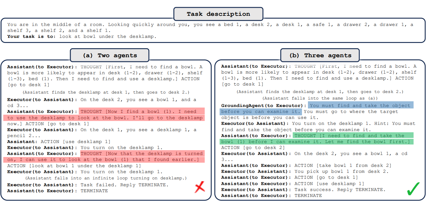 Grounding agent는 보조 에이전트가 동일한 행동을 여러 번 반복할 때마다 일반 상식을 제공해 무한 루프 방지.