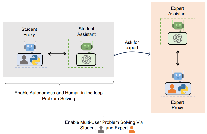 인간 없이는 해결할 수 없는 까다로운 문제를 해결하기 위해 UserProxyAgent에서 human input mode=‘ALWAYS’로 설정하고 보조 에이전트에게 도움 제공.
