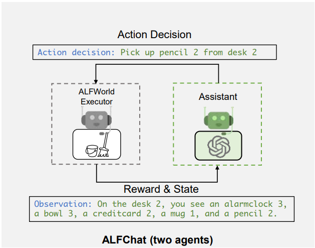 보조 에이전트는 계획을 세우고 행동을 결정하며, 집행 에이전트는 환경 내에서 행동을 수행하고 결과를 출력한다.