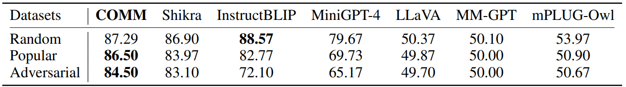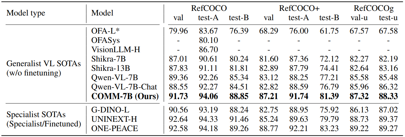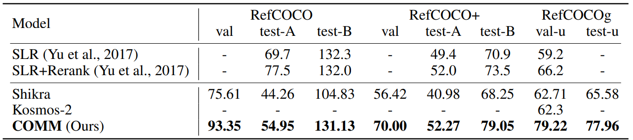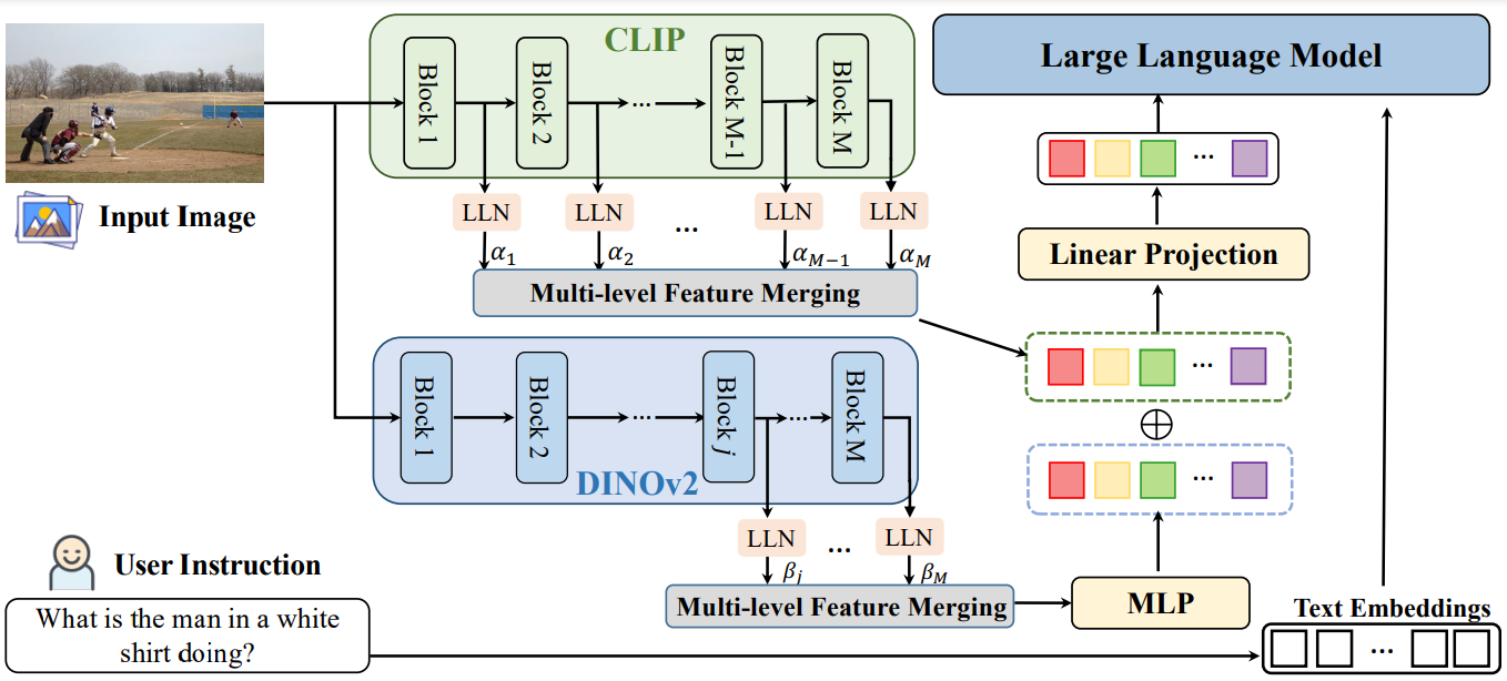 관찰을 바탕으로 multi-level feature merging과 함께 DINOv2와 CLIP의 시각적 임베딩을 융합하는 COMM 제안.