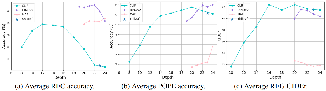 ViT의 각 레이어에서 추출된 feature를 LLM에 입력했을 때 레이어 깊이별 참조 표현 이해(REC), 참조 표현 생성(REG), 객체 환각 벤치마크(POPE)에 대한 정확도