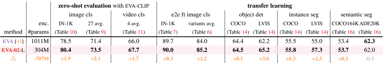 EVA-02 시리즈는 6M부터 304M까지 다양한 모델 크기가 포함되어 있으며 다운스트림 작업에 탁월한 성능을 보여줌.