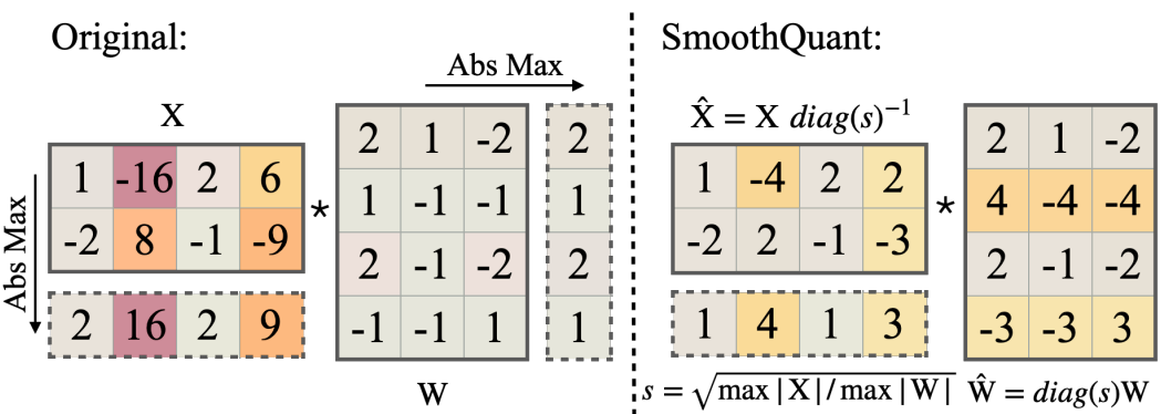 그래서, 채널별 양자화 대신 활성화 X를 평활화 인자로 나누어 평활화한 후 양자화 할 것을 제안한다.