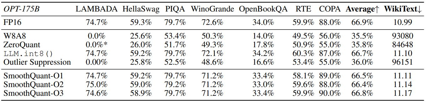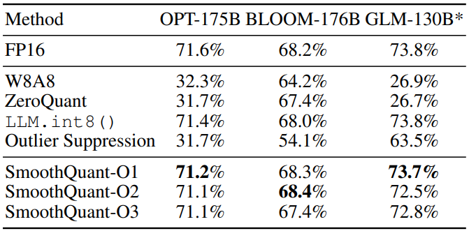 LLM에 대한 8비트 가중치, 8비트 활성화(W8A8) 양자화를 가능하게 하는 훈련이 필요 없고 정확도를 유지하는 범용 PTQ(훈련 후 양자화) 솔루션인 SmoothQuant 제안