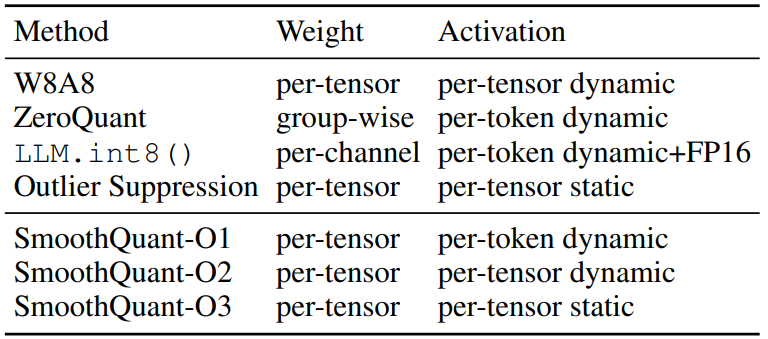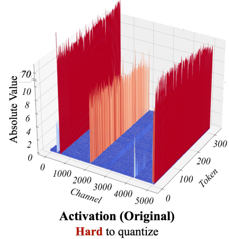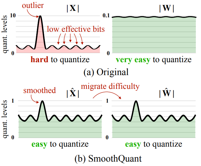 SmoothQuant는 이상치의 존재로 인해 활성화가 가중치보다 양자화하기가 훨씬 더 어렵더라도 토큰들은 채널 전반에 걸쳐 유사한 변형을 나타낸다는 관찰에 의존하여 양자화 난이도를 활성화에서 가중치로 이동시킨다.