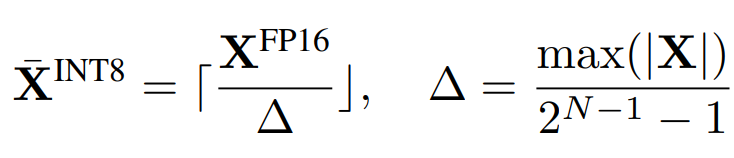 ( ∆ = 양자화 크기, ⌈⌋ = 반올림, N = 목표 비트, 또한 텐서가 0에서 대칭인 경우로 가정)