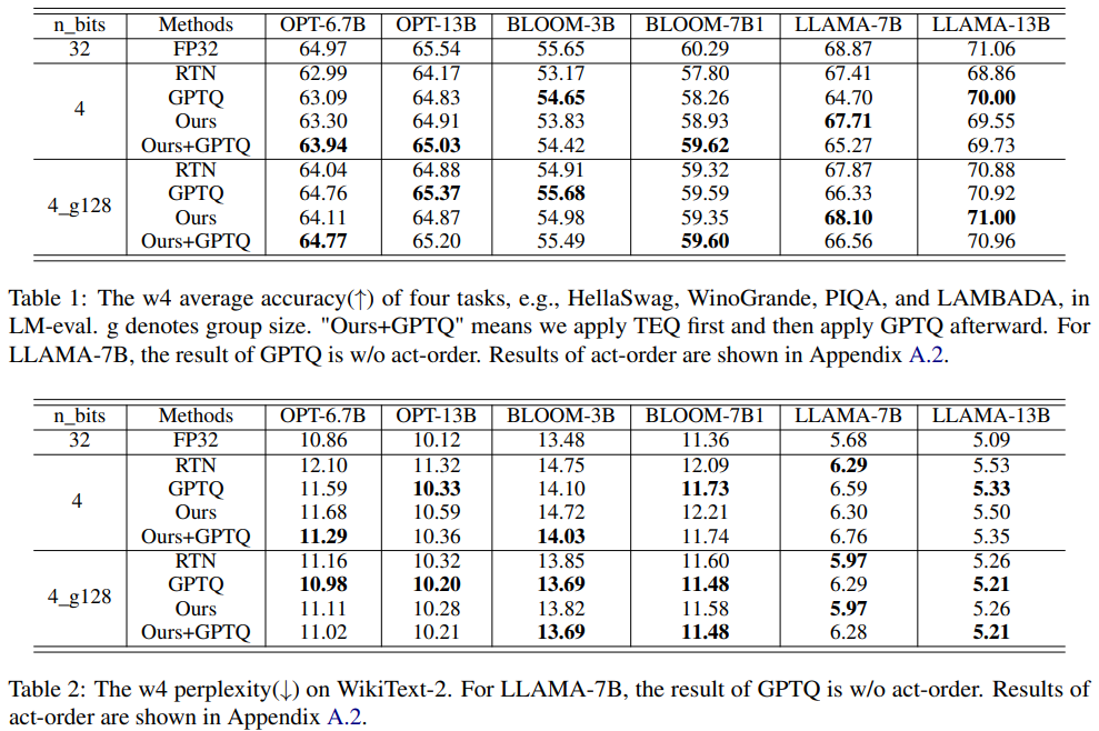 LLM(Large Language Model)에서 낮은 정밀도 양자화를 활용하면서 모델 출력의 FP32 정밀도를 유지하는 훈련 가능한 등가 변환인 TEQ 제안