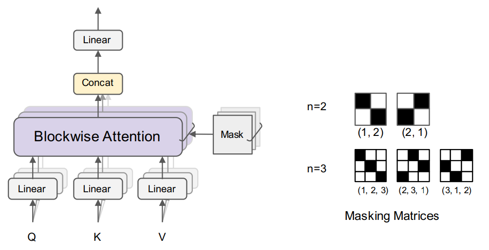 각 attention head에 무작위로 마스크를 할당하고(e.g. (1,2) 마스크에 10 heads, (2,1) 마스크에 2 heads) 각 Q에 대해 각 마스크에서 얻은 K, V에 대한 attention을 수행한다.