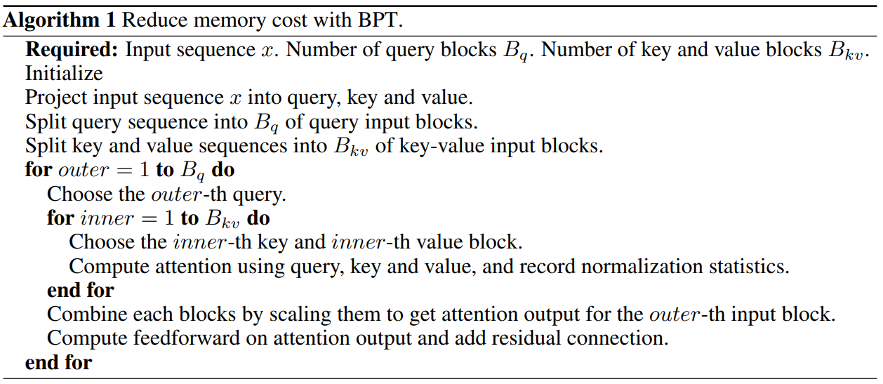 Self-attention의 블록별 계산과 feedforward network의 융합을 활용하여 메모리 비용을 최소화하는 독특한 접근 방식인 BPT(Blockwise Parallel Transformer)를 제안