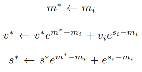 QKV 연산마다 다음과 같이 v*, s*, m*를 업데이트한다.