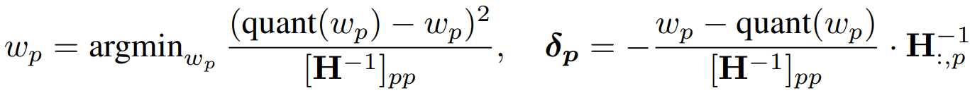 손실 변동이 가장 작은 인덱스를 제외한 다른 가중치는 동시에 양자화하지 않는다. 다른 가중치가 업데이트됨으로써 양자화 오류를 보상하여 전체적인 양자화 결과가 더 좋아질 수 있기 때문이다. 이전 챕터의 알고리즘 1에 양자화를 연결하여 가지치기와 통합할 수 있다. (언급은 안돼있지만 양자화/가지치기 후에 해당 인덱스는 고정할 듯)