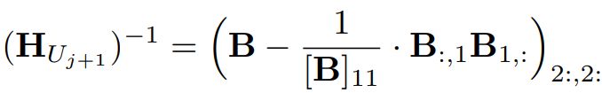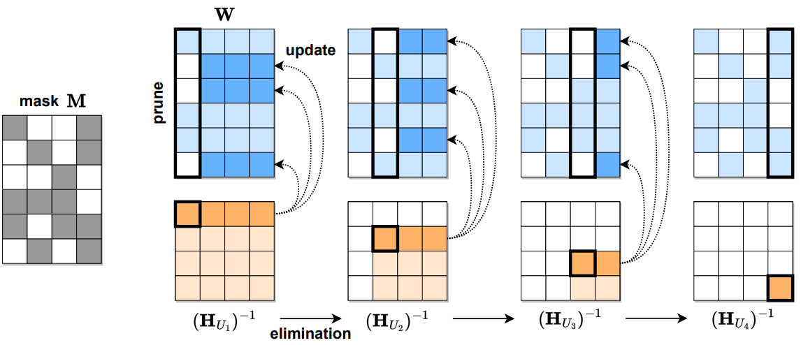 HU-1는 한 번 계산하면 W의 모든 행에 공유되며, HU의 열과 행의 제거에 대해서는 가우스 소거법을 통해 HU-1에 반영할 수 있다. (가우스 소거법에 대한 자세한 설명은 OBC 논문의 부록 참조)