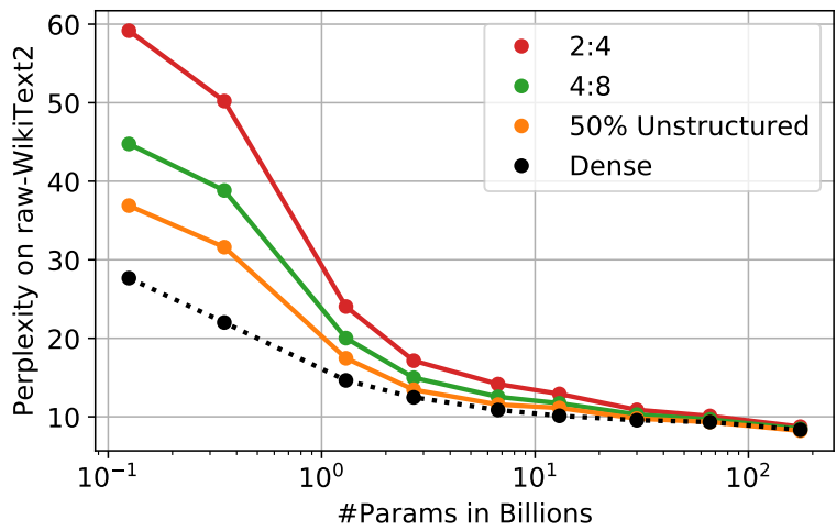 매우 큰 모델 규모에서 효율적으로 작동하는 최초의 one-shot 가지치기 방법인 SparseGPT 제안